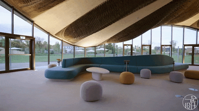 正在内部能够清晰的看到交织层压木材取机械人环绕纠缠的亚麻纤维段, 这些材料不只供给了建建布局所需的强度和韧性,其 海浪形的布局也为室内空间构成了奇特的视觉结果,