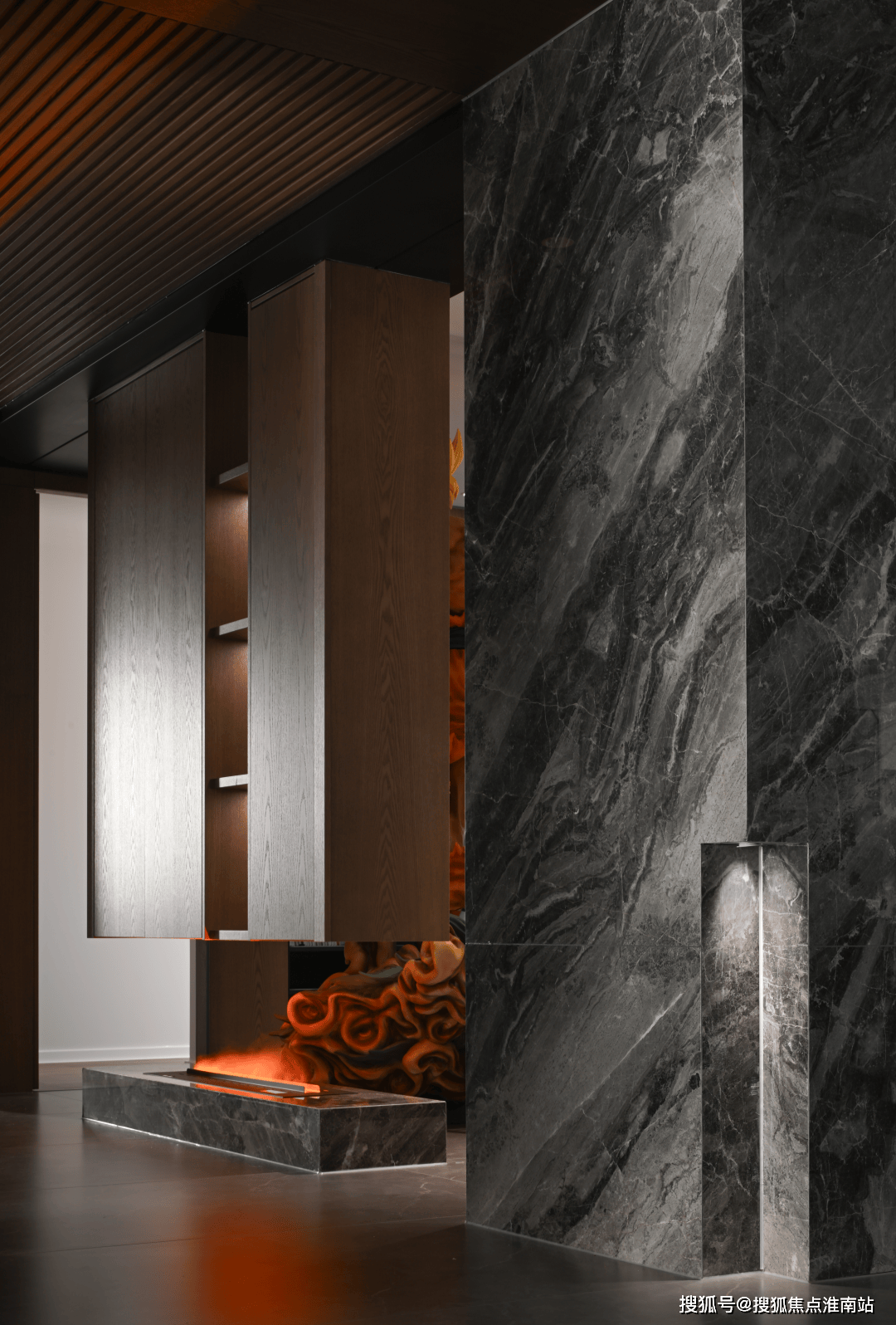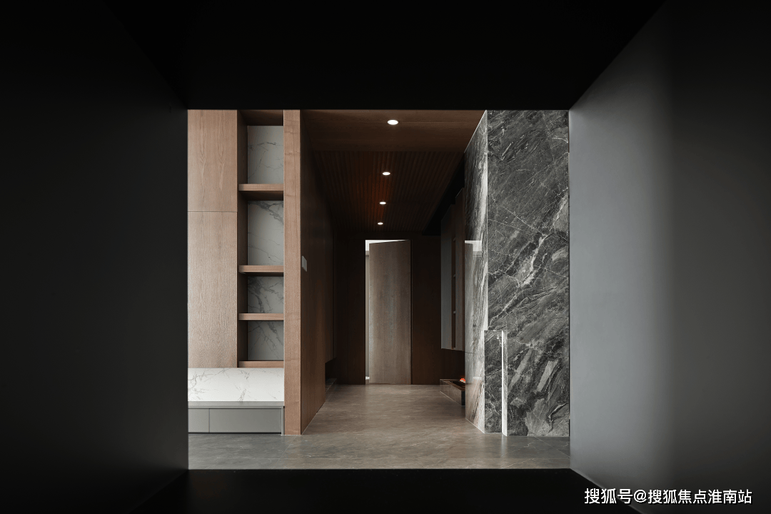 胁制的材质利用和通顶的门让走廊维持着外正在的简约,格栅的肌理和大理石的纹交错,悬挑和挖空带来参差的布局感,都丰硕着空间的细节和条理。
