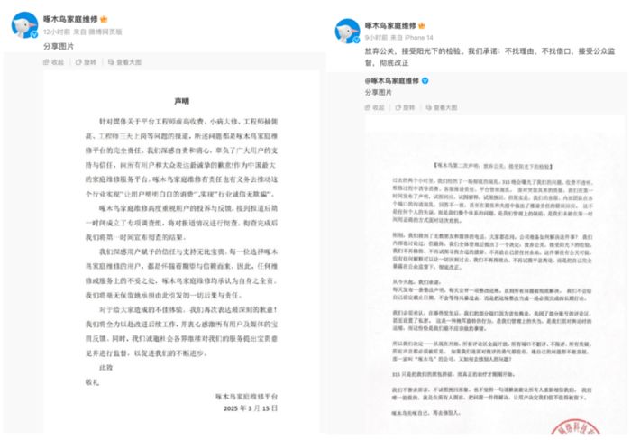 2025年,中国消费者协会确定全国消协组织消费年从题为“共建对劲消费”,可正在家居家电范畴,消费者权益事务频发。2024年3月15日,中国消费者协会发布2024年十大消费舆情热点,此中便涉及“串串房”甲醛超标等消费凸起问题。而正在刚竣事的央视315晚会上,号称“除了豪情不修,啥都修”的中国最大师庭维修平台啄木鸟更因办事质量问题被点名为“维修刺客”。事务被后,#315晚会维修刺客啄木鸟#等相关话题惹起了的强烈共识。虽然3月15日晚间,啄木鸟平台便连发两次声明暗示,“放弃公关,接管阳光下的查验。我们许诺:不找来由,不找托言,接管监视,完全更正。”“公司将每天发布一条整改声明,每天公开一项整改良展,曲到所有问题被完全处理。”但企业仍是陷入了空前的舆情信赖危机。